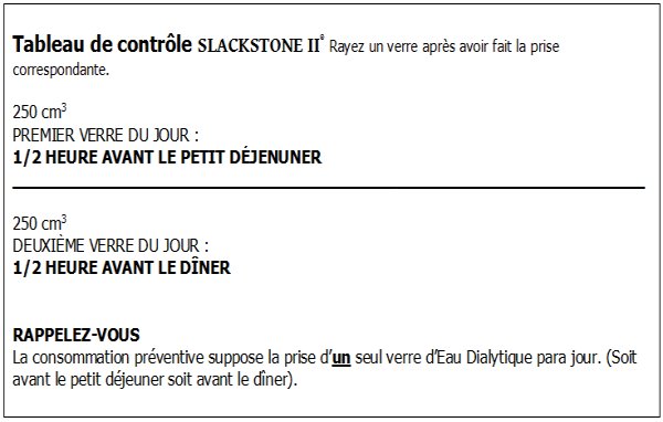 5.- Chaque ampoule sert à préparer 40 verres d'Eau Dialytique, soit une boîte de SLACKSTONE II® (contenant 2 ampoules) sert à préparer 20 litres d'Eau Dialytique.